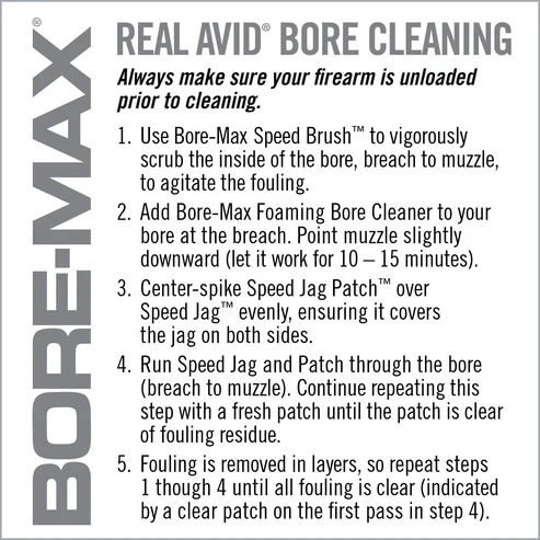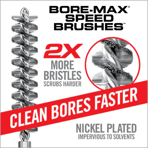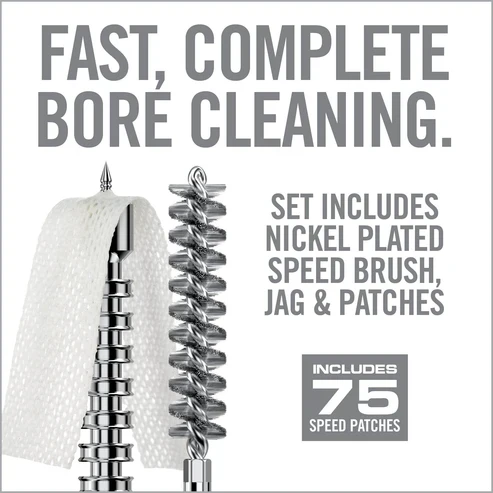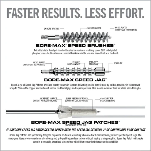 Twice the bristle density of standard brushes for maximum scrubbing power. Stiff, nickel plated phosphor bronze bristles reduce chemical breakdown in the bore and extend the life of the brush. To achieve maximum effectiveness, there needs to be an optimal balance between bristle density and bristle flexibility. The bristle configuration of the Bore-Max Speed Brush provides maximum scrubbing density while retaining enough flexibility to effectively reach down into the lands and grooves. The elongated Speed Jag features multiple compression rings along the entire length of the jag. Bore-Max Speed Jag and Patches are precisely sized to provide the optimal compression and contact to wipe the inner surface of the bore. Tight along the entire length, yet still relatively easy to push through. The Speed Jag and Patch system gets more patch material in the bore, eliminates bunching and maximizes the effectiveness of each pass-through. Speed Patches are a synthetic material that that has shown superior absorbency over cotton. This material is also more effective at picking up and trapping crud. One pass-through the bore of Speed Jag and Speed Jag Patch delivers the same results as pushing up to 4 or more traditional jags and square patches.