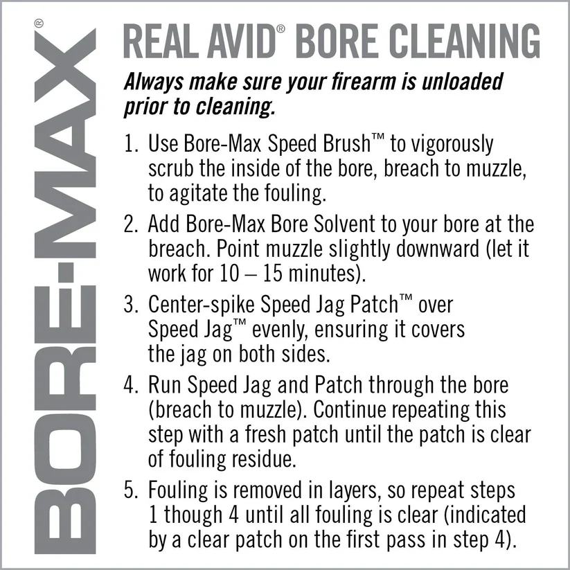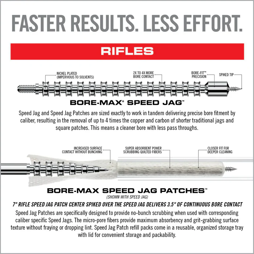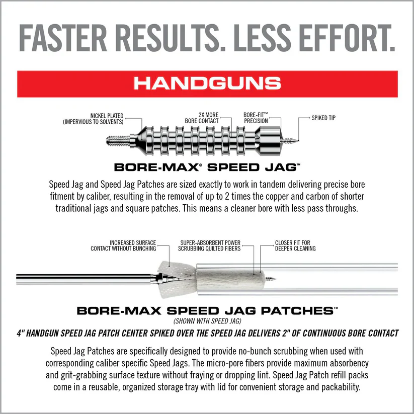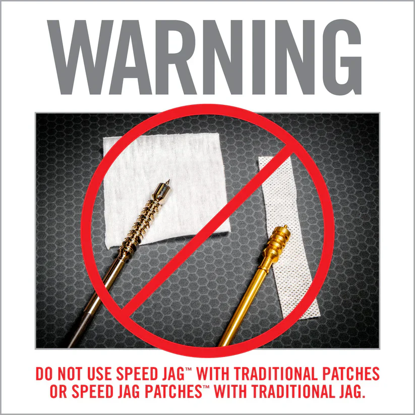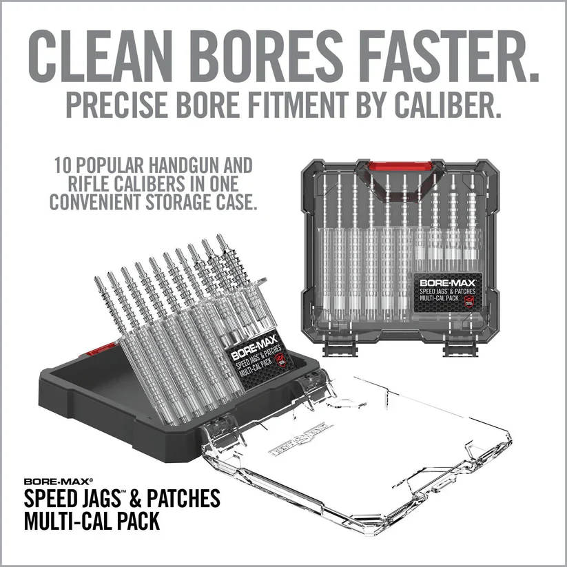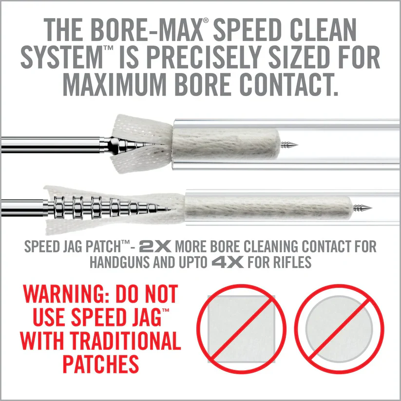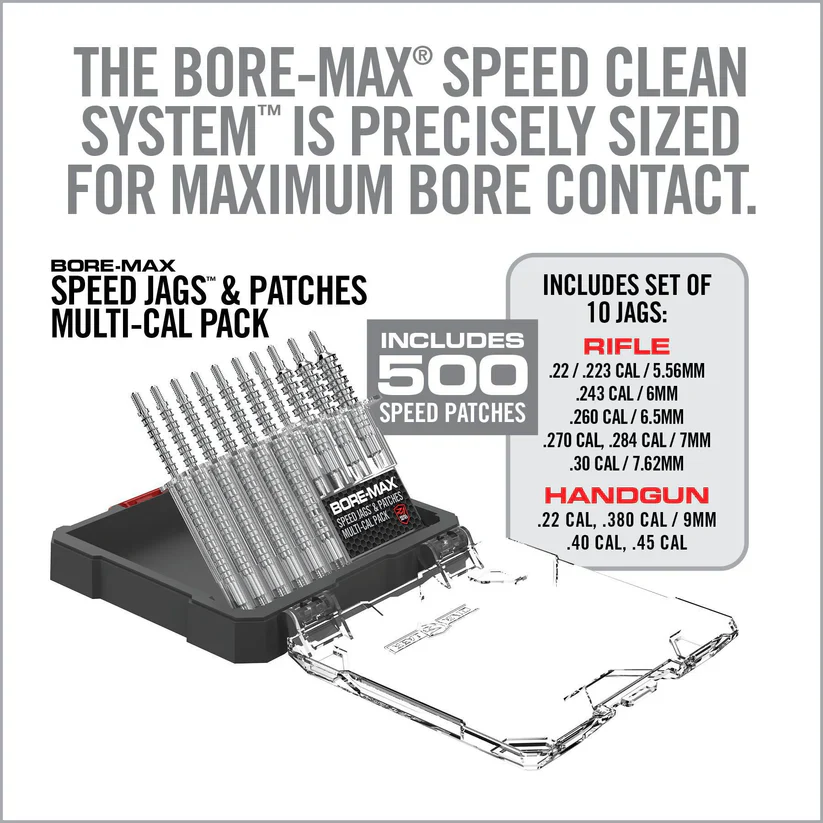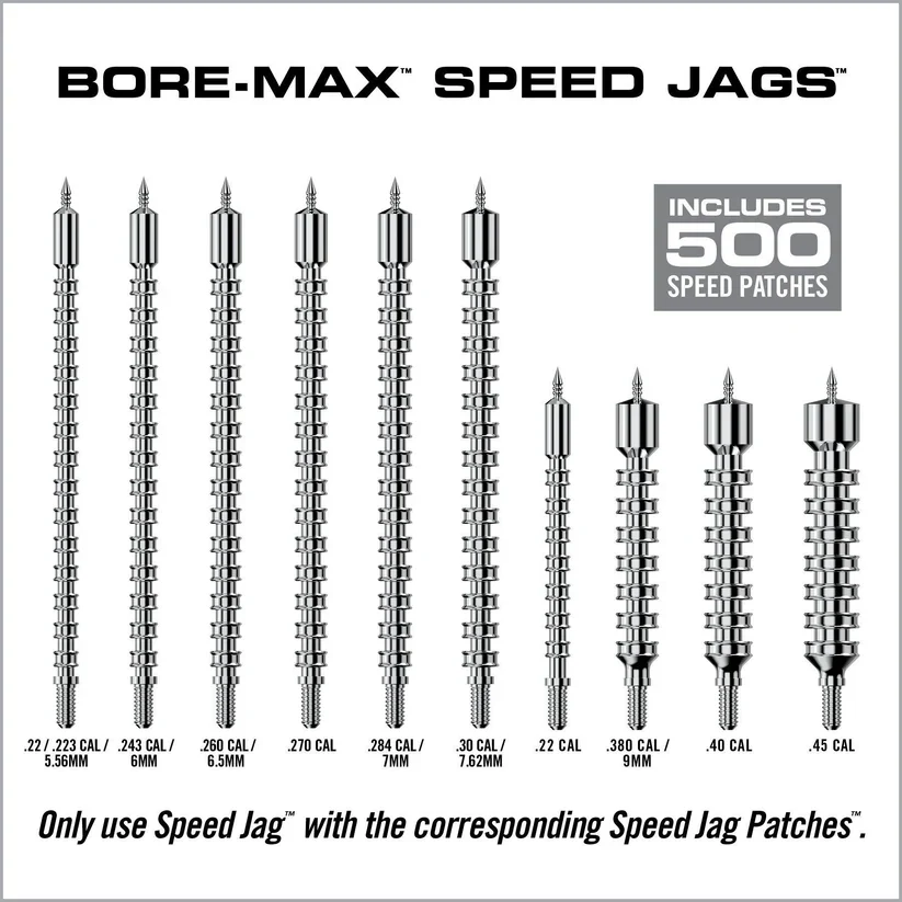 The Bore-Max Speed Jags & Patches Multi-Cal Pack heralds a new era in firearm maintenance, delivering up to 4x more bore contact for superior cleaning results. This comprehensive system includes ten specially designed jags for both handguns and rifles, covering an impressive range of calibers from .22 to .45 for handguns and .22/.223 to .30/7.62mm for rifles. Each jag is nickel-plated, ensuring longevity and resistance to chemical breakdown. Paired perfectly with these jags are the Speed Jag Patches, engineered from micro-pore fibers to offer superior absorbency and a grit-grabbing surface texture. The patches are uniquely designed to conform to the jags, avoiding the issue of bunching and thus enabling deeper and faster cleaning of your bore. Together, this caliber-specific set brings efficiency to a new level, saving you both time and effort while ensuring your firearms are maintained in peak condition. Use caution: Speed Jags and Speed Jag Patches are compatible exclusively with each other and should not be used with standard jags or patches to prevent damage or less effective cleaning.