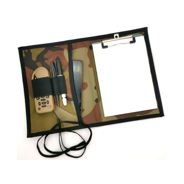 It comes with a clipboard and paper booklet to make notes on and has an elastic band to store your Kestrel/Weather Meter, pen and sharpie. Inserted in the back is a pocket to store your notes.