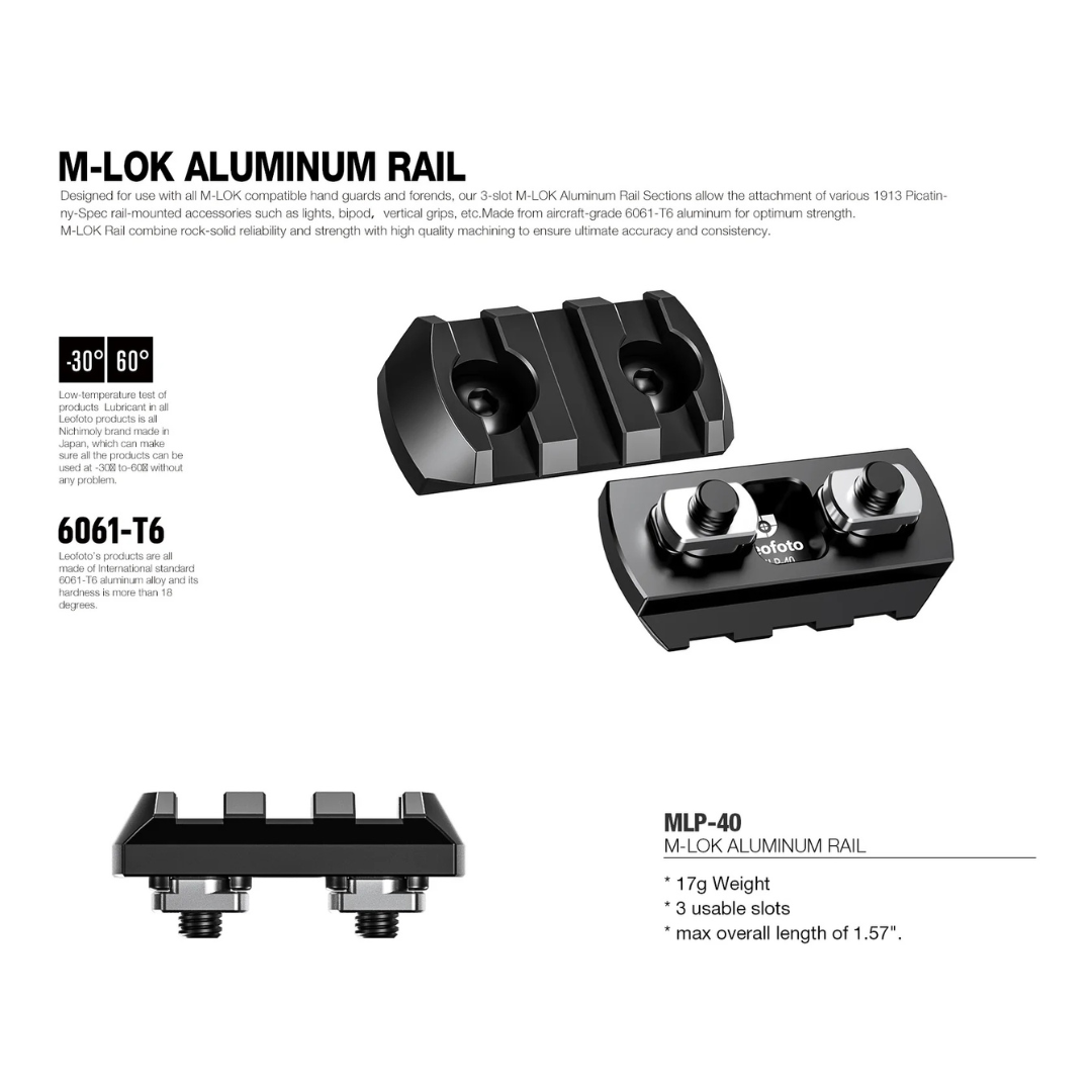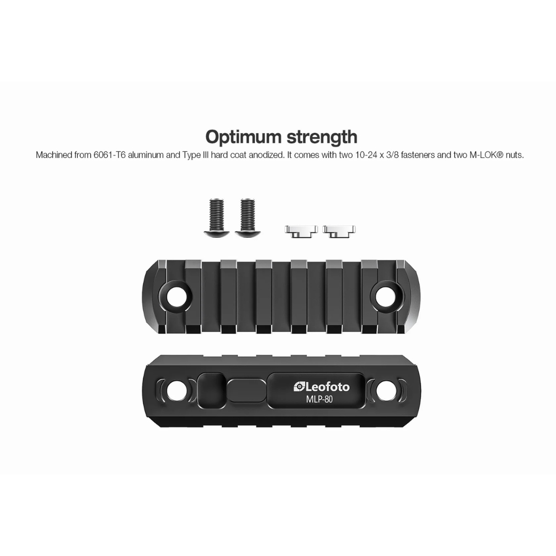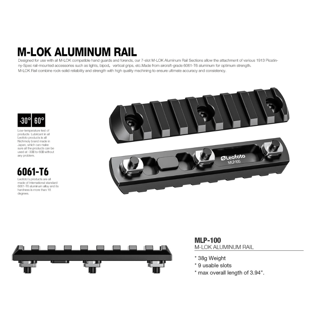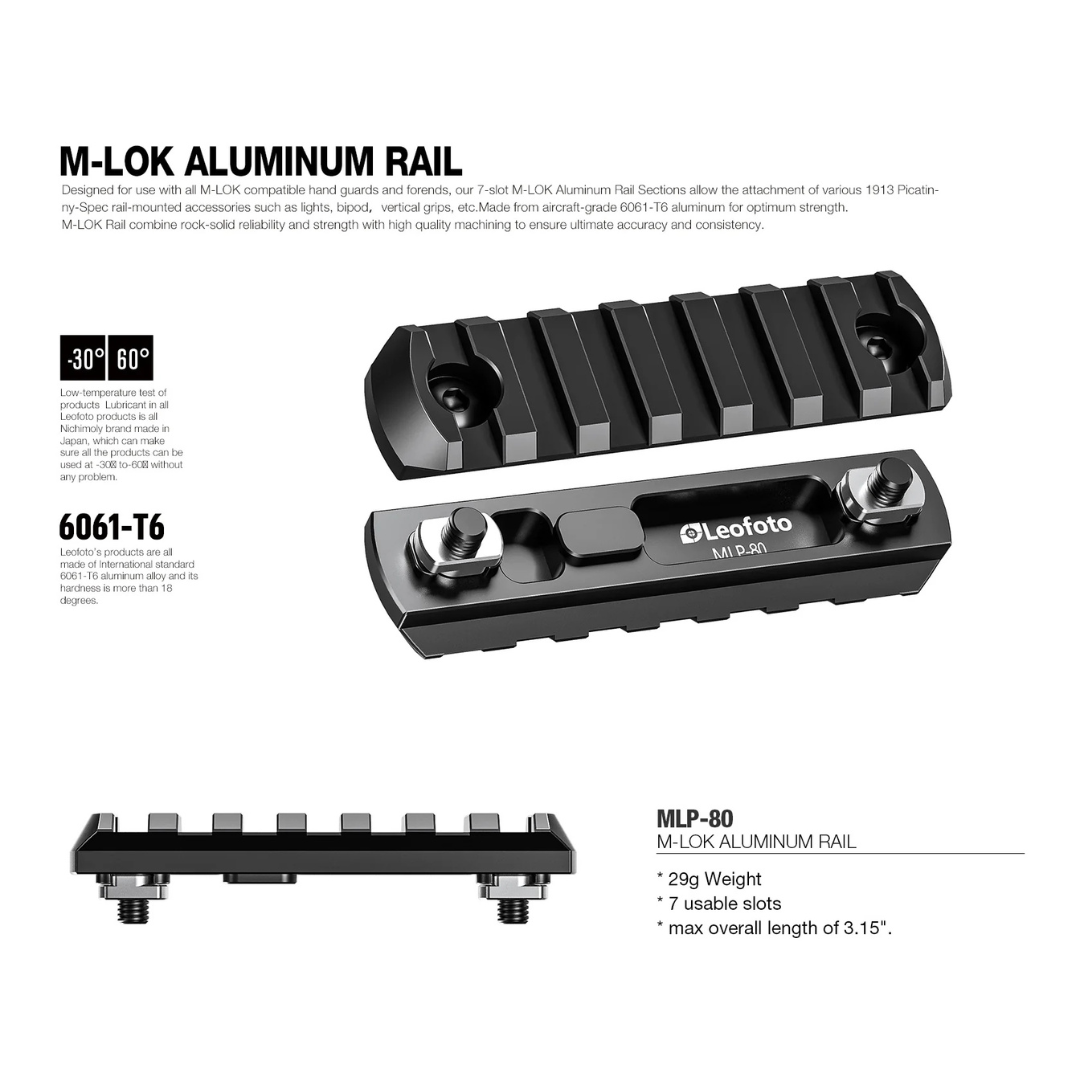 The Leofoto MLP Series M-LOK Quick Release Plate is Picatinny compatible. The plate is CNC machined from T6061 and hard anodized for durability and can be secured to the M-LOK handguard of compatible rifles. Rifle accessories can then be easily mounted via the picatinny rail.