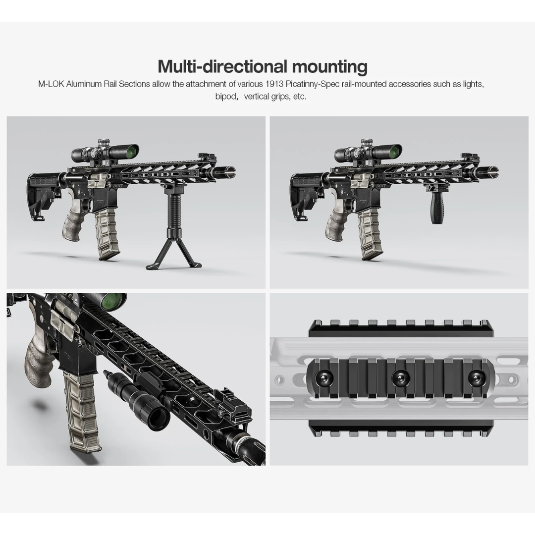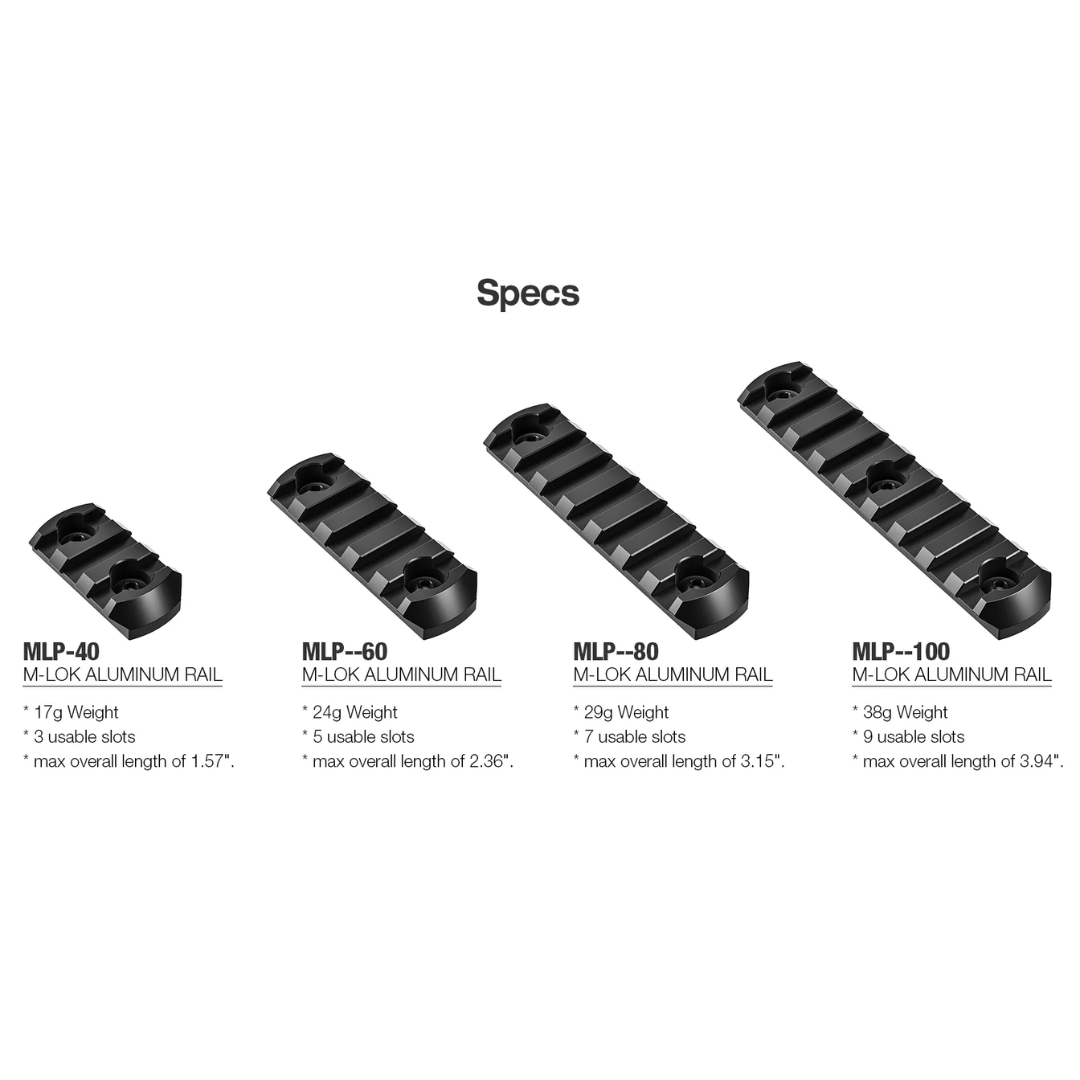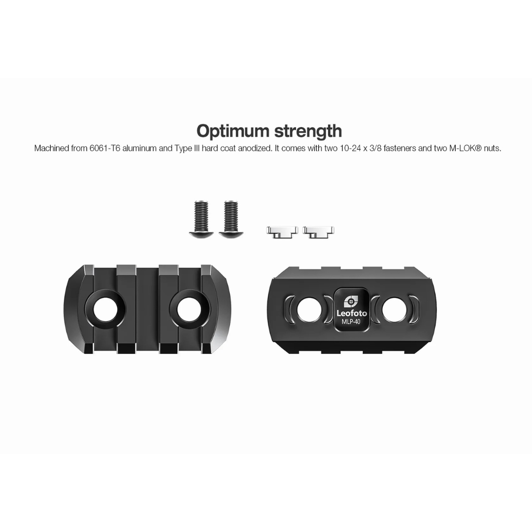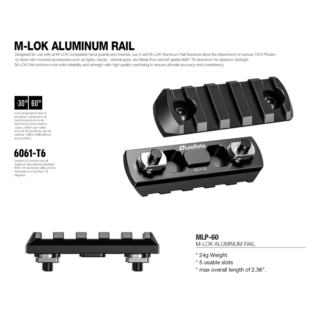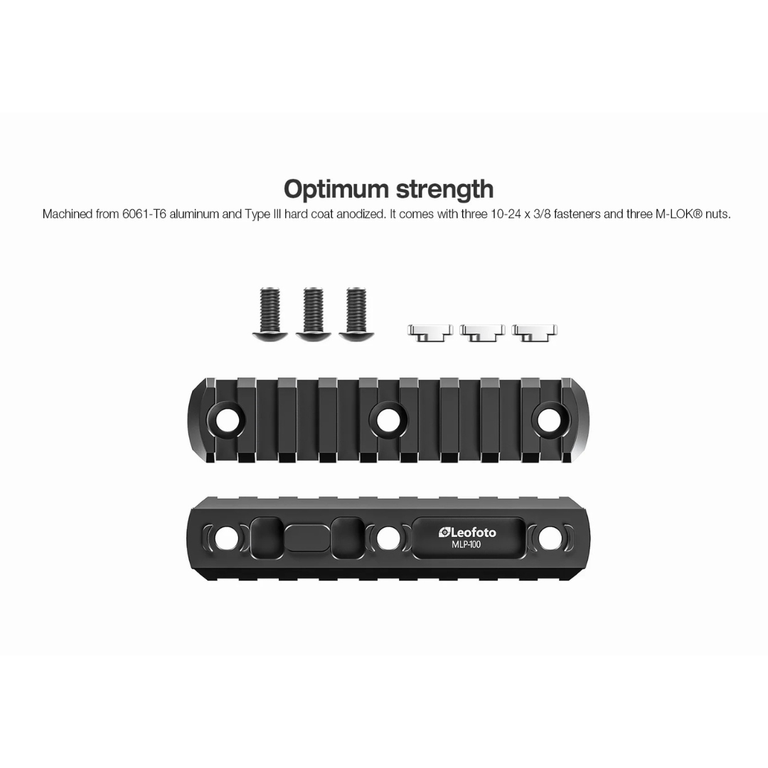 The Leofoto MLP Series M-LOK Quick Release Plate is Picatinny compatible. The plate is CNC machined from T6061 and hard anodized for durability and can be secured to the M-LOK handguard of compatible rifles. Rifle accessories can then be easily mounted via the picatinny rail.