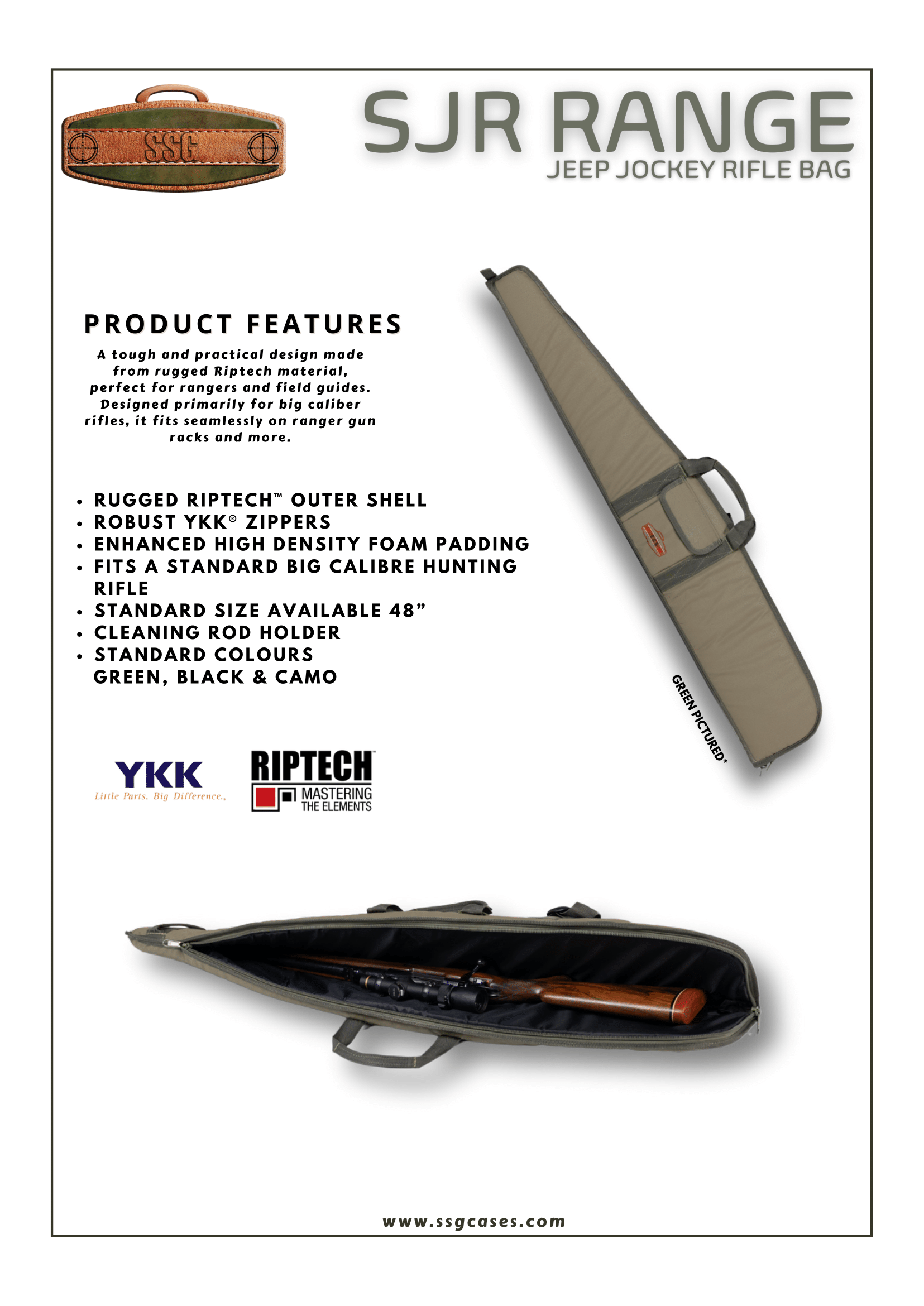 - Standard colours: Green, Black, Camo